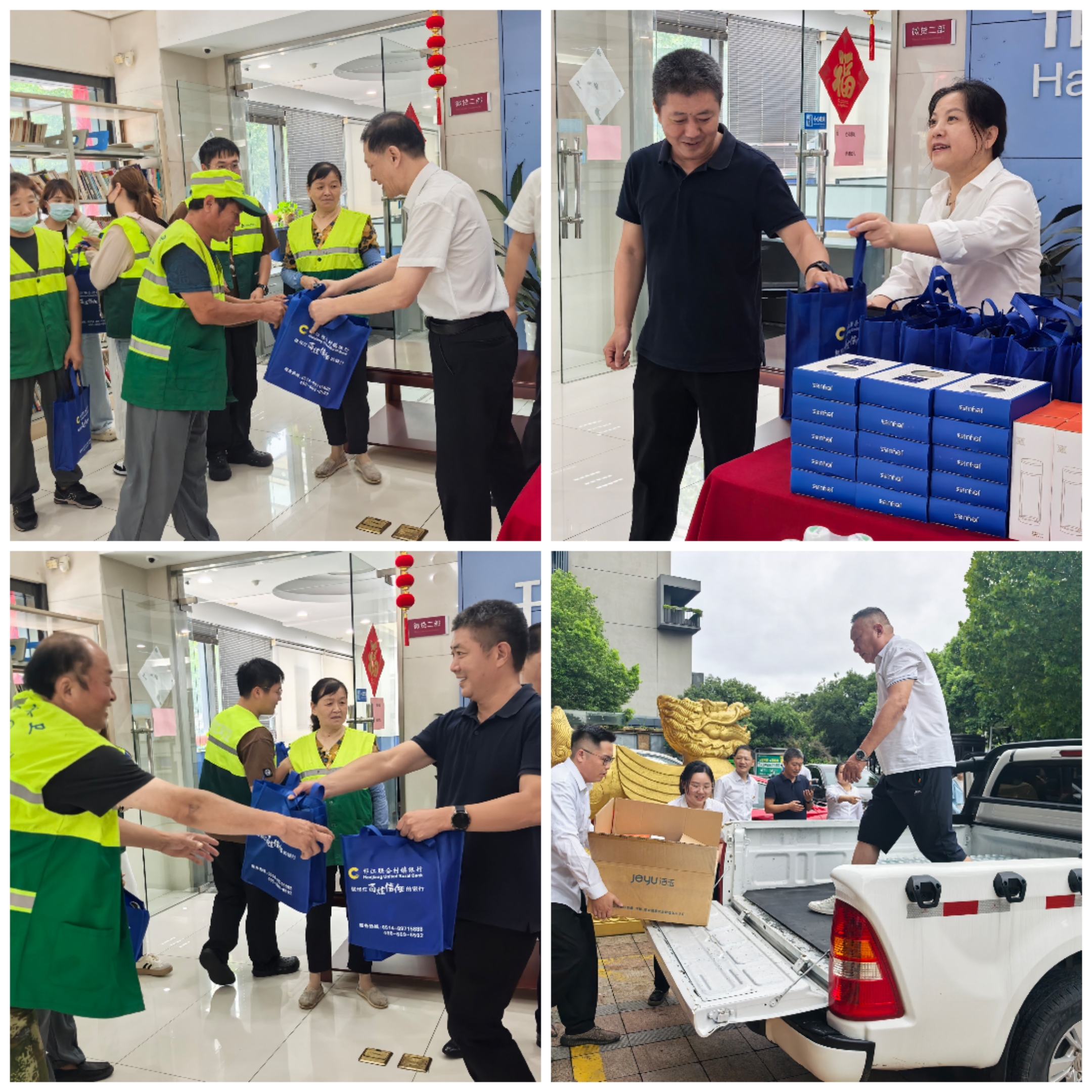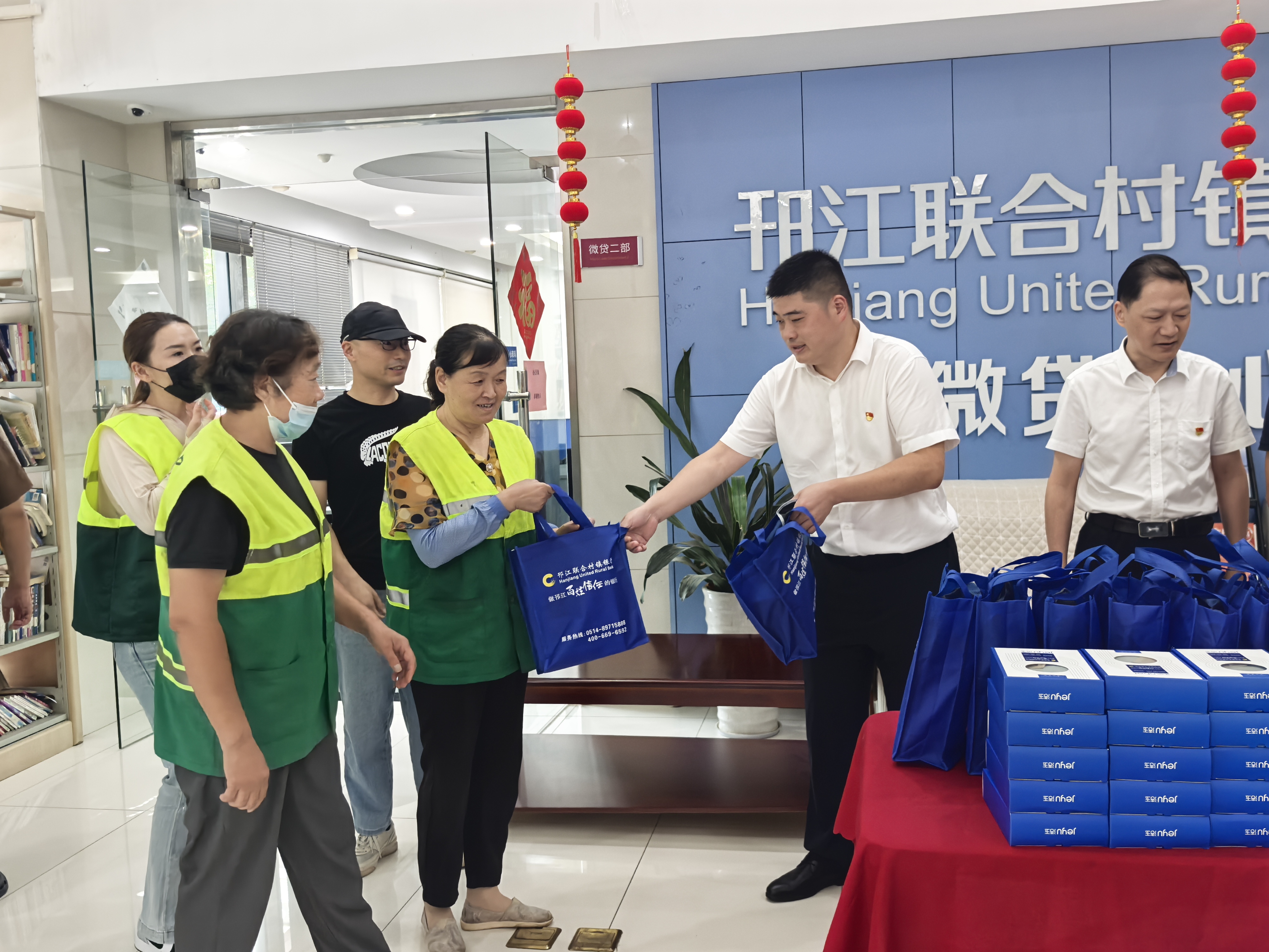 盛夏骄阳似火,街头巷尾的“城市美容师”们依然默默坚守。当我们享受着室内的清凉时,有这样一群人,他们头顶烈日,脚踩热浪,用辛勤的汗水守护着城市的整洁与美丽,他们就是可敬的环卫工人。为深入践行党的群众路线,充分发挥党员先锋模范作用,切实关怀一线劳动者,8月11日下午,我行党支部书记曹俊联合工会、团支部开展了“ 情系环卫送温暖 架起党群连心桥”慰问环卫工人公益活动,为邗江区城管局双桥街道环卫所的工人们送去一份党组织的关怀,邗江区环境卫生管理中心主任黄锋、双桥街道环卫所等工作人员一并参加。