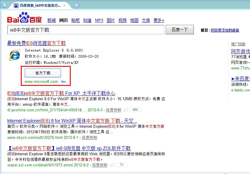 1、 XP系统浏览器IE6版本下,使用本行网银时,操作界面可能会产生一些错误,建议将浏览器升级到IE8,以便安全、正常使用。可通过百度(www.baidu.com)下载IE8浏览器,如下图所示:
