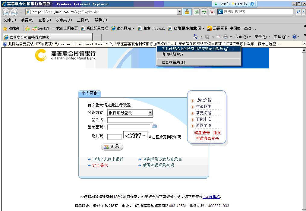 2、 首次登陆个人网上银行页面时,页面上方会提示安装加密控件,点击右键,选择“为此计算机上的所有用户安装此加载项”,安装该控件,如下图所示: