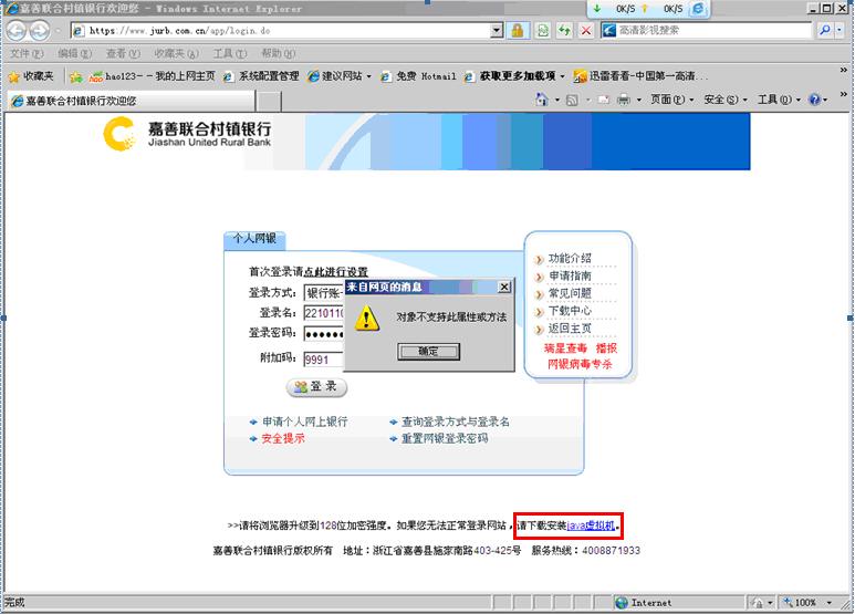 3、 登陆个人网上银行,点击“登录”后,画面显示“对象不支持此属性或方法”。请下载安装登陆页面正下方的java虚拟机,如下图所示: