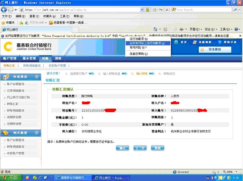 4、 预制证书(U盾)用户在第一次转账时,进入汇款确认页面时,页面上方会提示“此网站需要运行以下加载项……”,点击右键,选择“为此计算机上的所有用户安装此加载项”,安装该控件,如下图所示。安装后画面会刷新返回前一页面,用户需重新填写汇款相关信息。