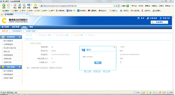 5、 用户在汇款确认页面点击确认或签名按钮后,如果页面提示“请输入兑付地址”而导致无法转账,请先点击“确认” ,再点击“上一步”,在转账信息录入画面直接点击“下一步”,再次进入汇款确认页面,再次点击确认或签名按钮,输入相关密码后,即可正常完成转账。
