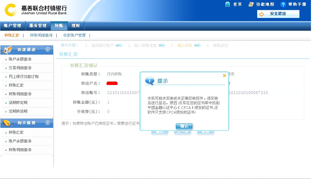 6、 如果安装控件后,在转账时遇到下列情况,提示“未安装或正确安装控件”,请在下载中心栏目中重新安装证书工具或JAVA虚拟机,重启电脑。