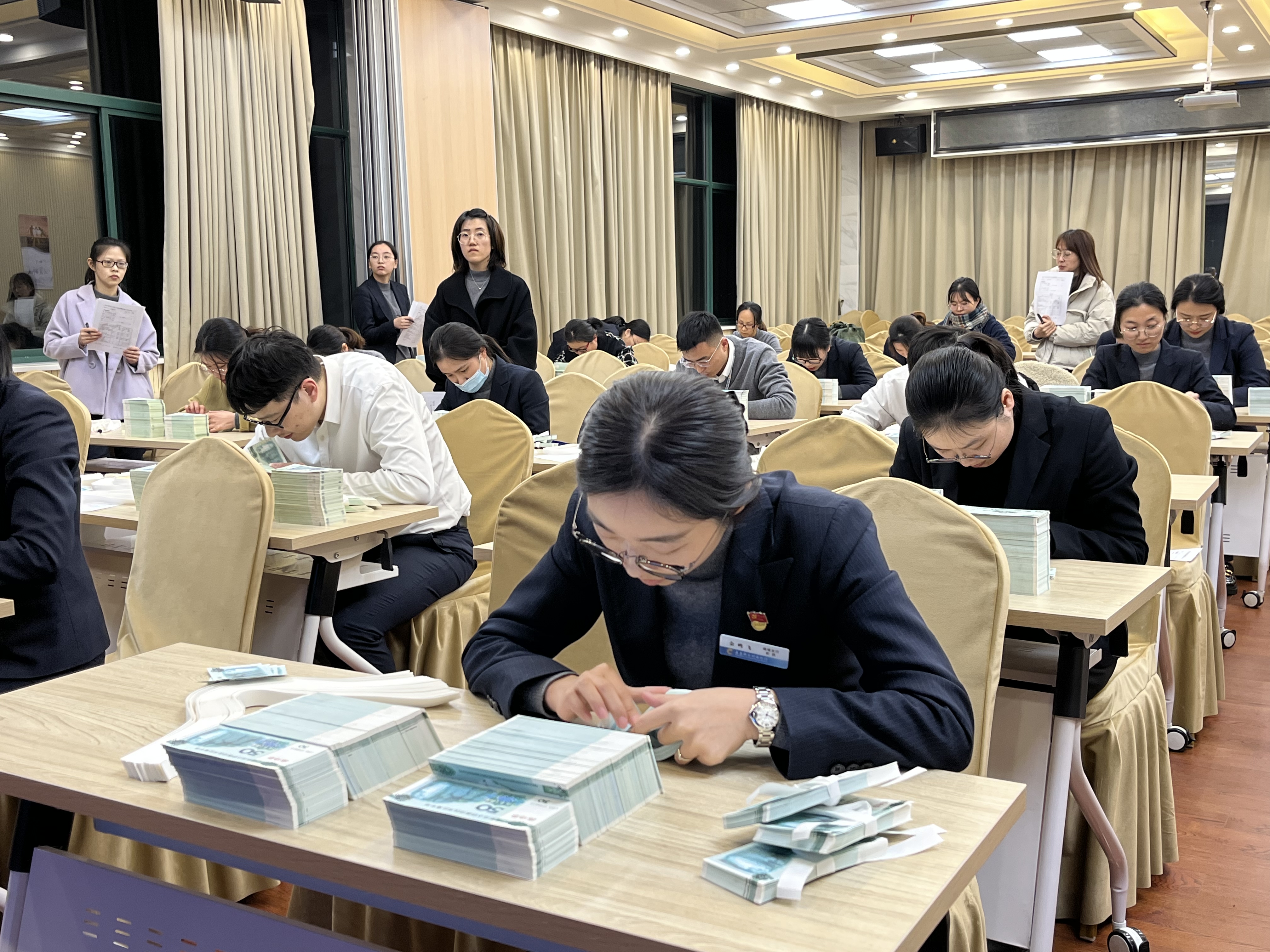 本次竞赛由管理部门、各支行(营业部)经过初赛选拔,选取队员组成9个参赛队共27名选手参加比赛。竞赛共分为单指单张点钞、多指多张点钞、电脑传票输入、汉字输入等四个比赛项目。比赛现场,参赛员工们个个全神贯注,争分夺秒,裁判员们公正裁判、一丝不苟。