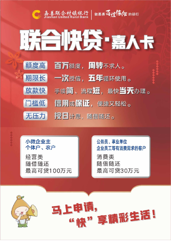 在嘉善县范围内有固定居所,符合小额贷款条件,自愿遵守本办法,并经审批同意授信的年满十八周岁,具有完全民事行为能力的农户、居民、个体工商户、小企业业主,均可申请“联合快贷”业务。