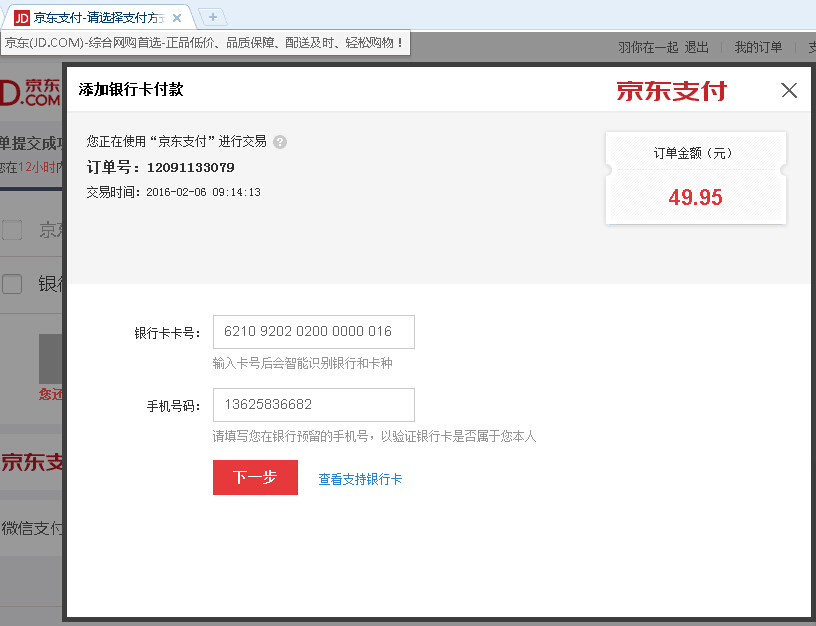 2、画面跳转到京东支付界面,在下方直接输入联合卡卡号、手机号码,点击“下一步”。