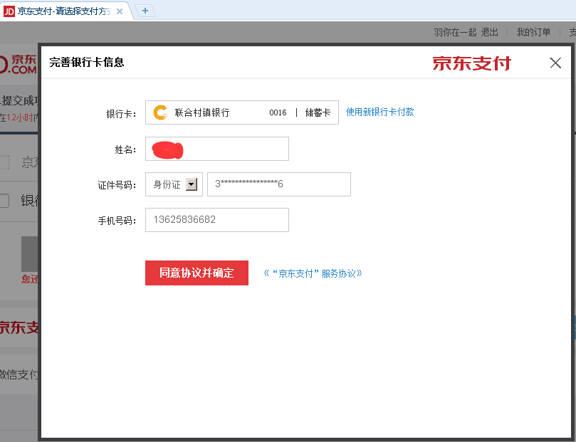 3、跳转到支付确认画面,确认画面会显示卡号的所属银行名称、姓名和证件号码。点击“同意协议并确定”。
