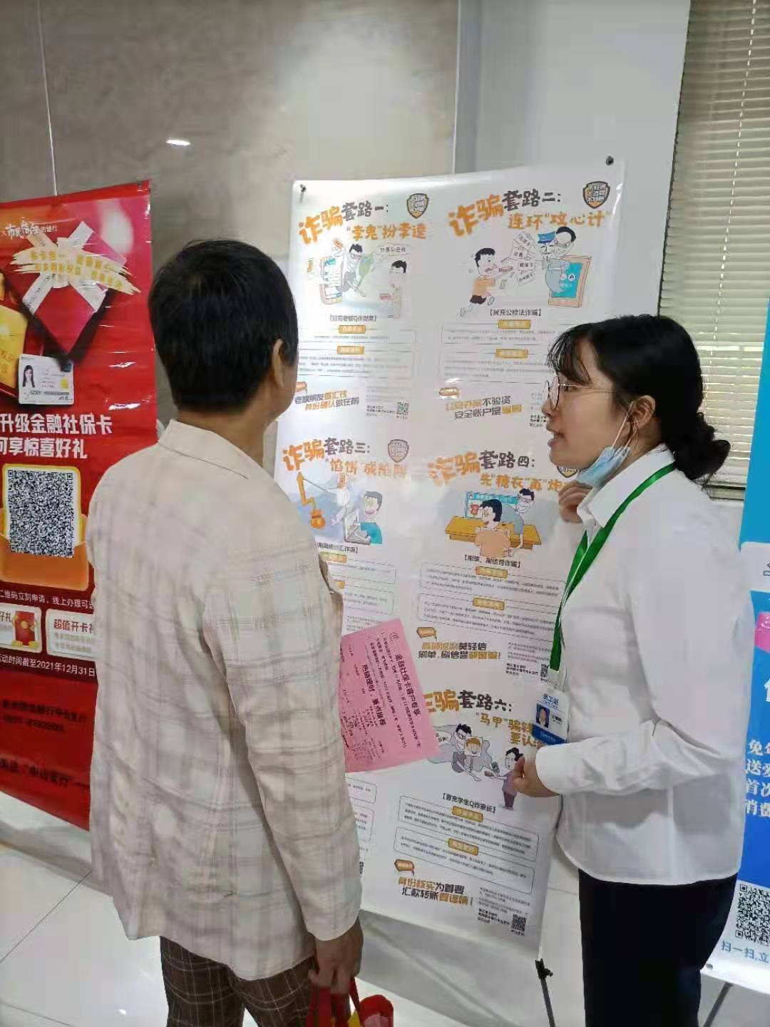 中山支行利用客户办理业务等待期间,向客户深入浅出的普及防电信诈骗、非法集资、辨别真假币等金融知识,引导大家正确使用金融产品与服务,增强自身权益保护意识。