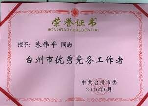 作为一名党务工作者,朱伟平行长以全心全意为人民服务的观念、耐心细致的工作作风、持之以恒的奉献精神,倾入党务工作的满腔热情,推动单位党建工作一年一个台阶,从无到有取得了不断发展,促进了单位改革发展事业不断进步,深受党员和群众的好评,同时也受到了上级党组织授予台州市优秀党务工作者的肯定。这是其个人的荣誉,更是我单位的骄傲,也为广大平凡岗位上的党员们树立了一个榜样。
