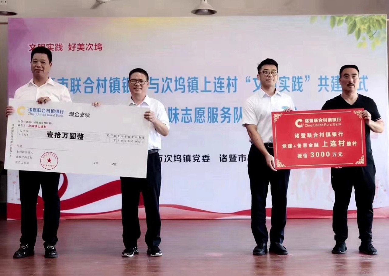 会上,诸暨联合村镇银行向次坞镇上连村“小棉袄”关爱基金捐赠人民币10万元,支持其开展村级助学、助医、助老、助困等慈善救助项目。同时,我行还为上连村整村授信3000万元,通过金融赋能文明的形式,共同打造文明实践新标杆。